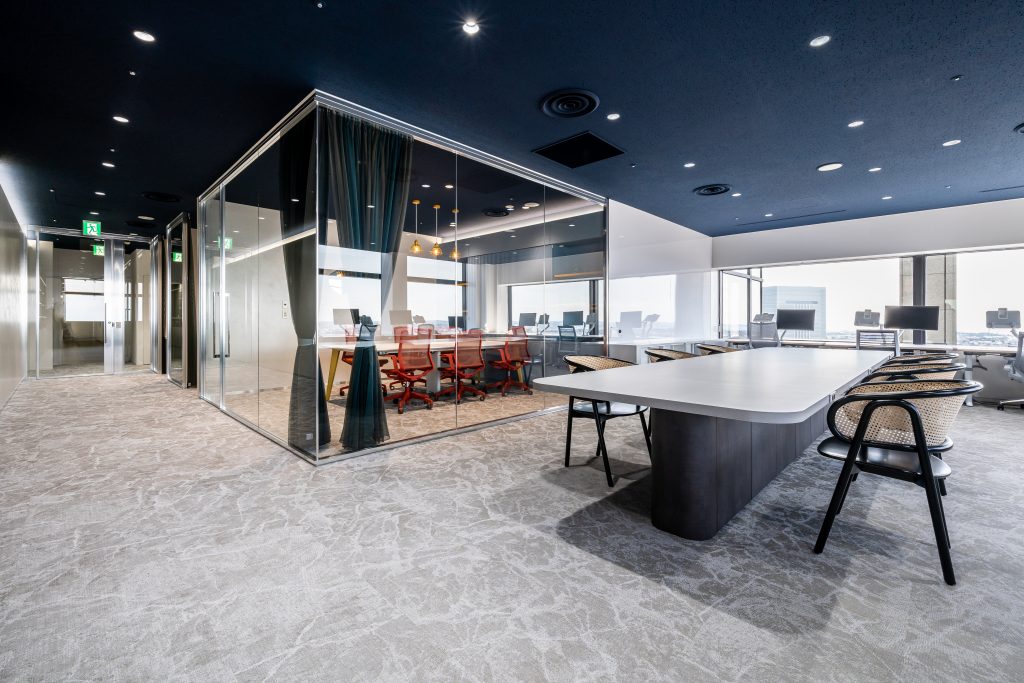 さらに、カンファレンスルームと執務エリアはあえてガラスの間仕切りでゆるやかに区切り、空間全体が一体感のある印象になるようデザイン。視線の抜けを活かして、実際の面積以上に広さを感じられる空間となりました。