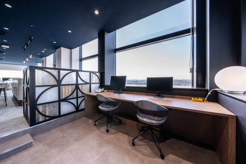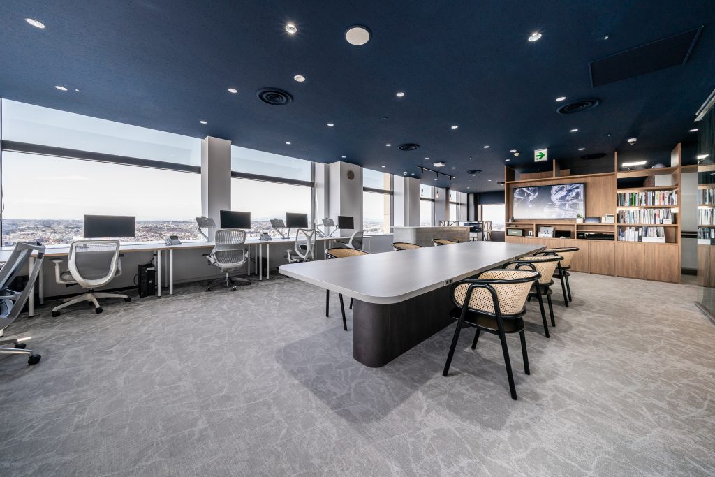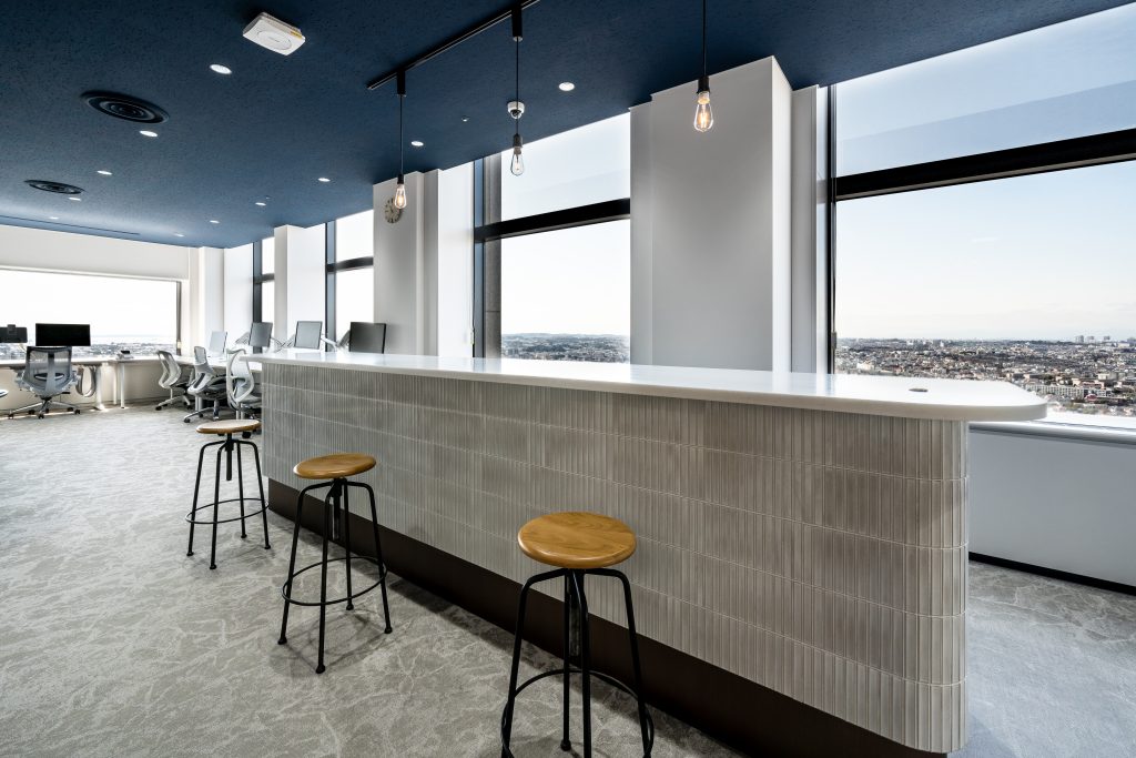また、景観を楽しめる執務スペースでは、什器の高さを抑え、デスク間の通路もゆったりと確保。視界を遮らないことで、圧迫感のない、のびのびとした空間に仕上げています。