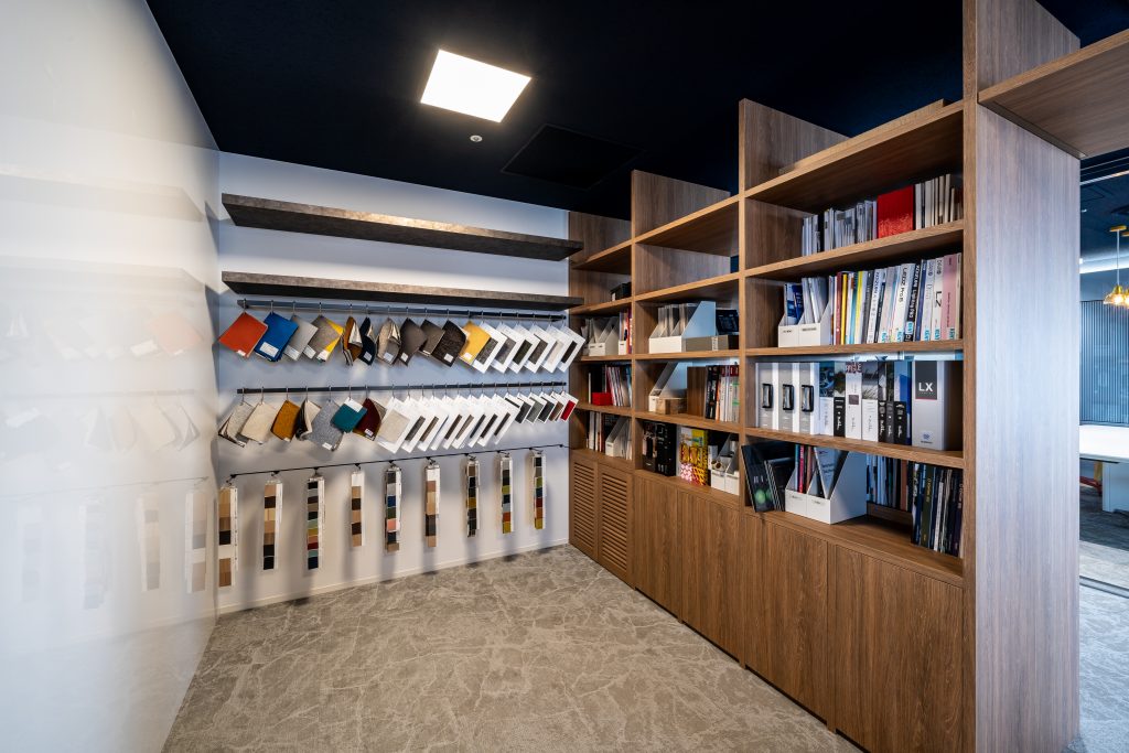 “魅せる収納”では、建材サンプルやメーカーカタログなど、お客様が当社らしさを感じられるアイテムをディスプレイ。