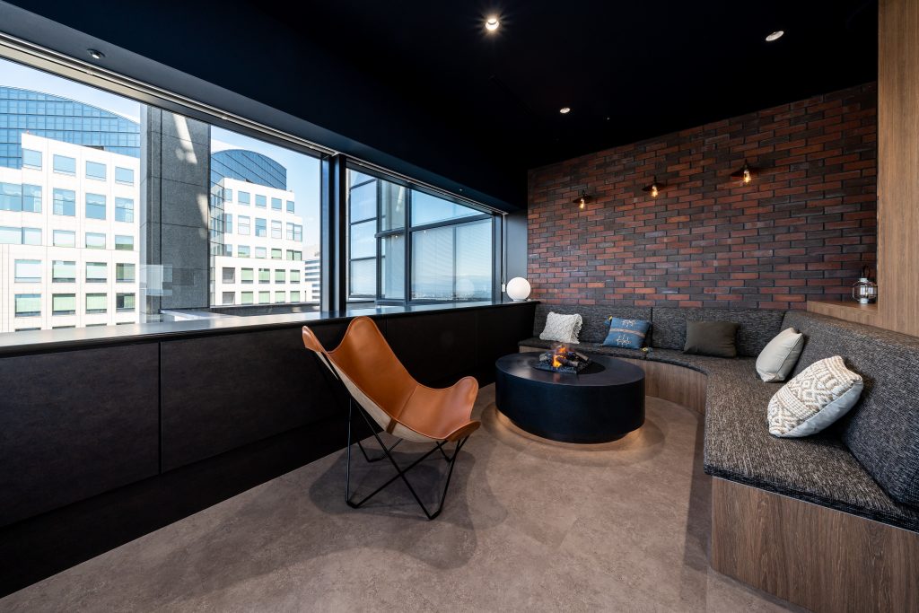 グレーを基調とした執務室から階段を降りると、ブラウンと赤レンガを取り入れた横浜らしい雰囲気のdomaエリアが広がります。