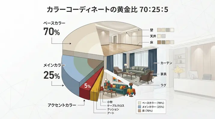 応接室の内装デザインを考える際は、「カラーコーディネートの黄金比」に基づいて配色を決めていくのが王道です。一般的な王道の型は、ベースカラー70%、メインカラー25%、アクセントカラー5%の「70:25:5」となっています。
