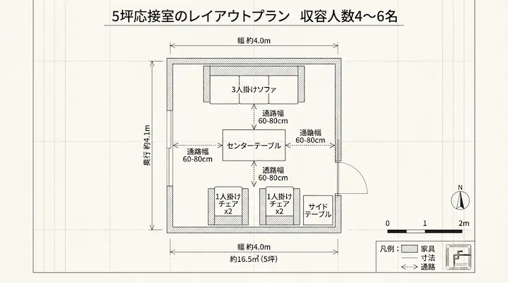 応接室の広さが5坪の場合は、4~6人の収容人数を想定してレイアウトを決めるとゆったりとした空間を確保できます。配置イメージは、「1人掛け椅子×4~6」または、「3人掛けソファ×1、1人掛け椅子×2」で、必要に応じてサイドテーブルの設置も検討してください。また、スムーズに人がすれ違える60cm~80cmほどの通路幅を設けることも重要です。