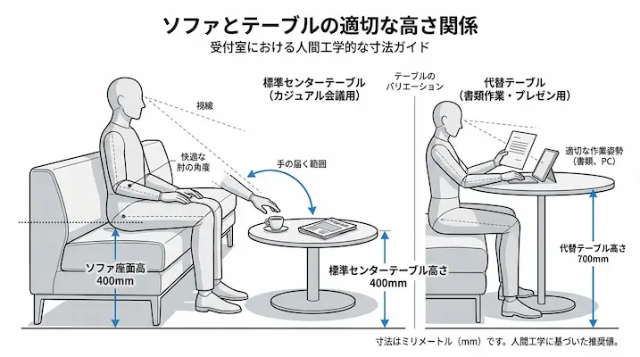 応接室のセンターテーブルはソファの座高面と同じ400mm程度のものを選ぶのが一般的ですが、場合によっては書類を書いたりしやすい700mm程度のものを選択するのも一つの考えです。このように、応接室に設置するソファとテーブルの高さは、自社の商談スタイルに応じて選ぶのがポイントです。