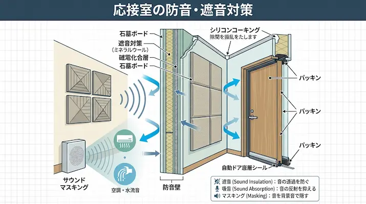 重要な商談や気密性の高い会議などを行う応接室では、外部への情報漏洩や音の反響を防ぐために遮音と防音の対策が必要になります。まずは、ドアや壁の隙間から音漏れしないように設計するのがポイントです。具体的には、壁を防音にする、ドアや壁の隙間をパッキンやシリコンコーキングで埋めるなどの処置を講じる方法があります。
