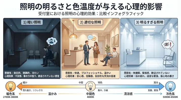 照明の明るさや色温度は、応接室を訪れる人の心理状態に大きな影響を与えます。例えば、暗めの照明を採用すると、閉鎖的な印象を与えてしまい、商談に悪影響を及ぼす可能性があります。ただし、明るければ良いというわけではなく、業種やターゲットに応じた適度な明るさを確保するのが重要です。